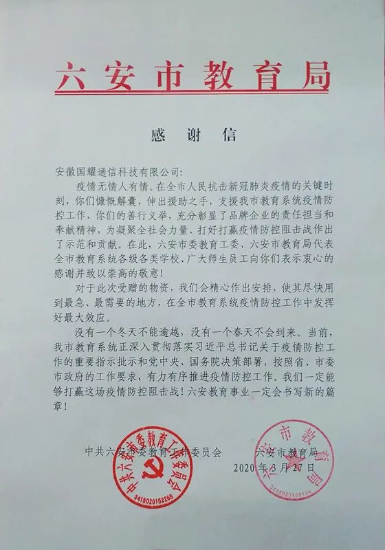 2020年初,新型冠狀病毒肺炎疫情洶涌來襲,給人民群眾生活帶來嚴(yán)重影響。此次疫情也牽動著安徽國耀通信科技有限公司全體人員的心。能為全市教育事業(yè)盡一點(diǎn)綿薄之力是每一個有責(zé)任感的企業(yè)應(yīng)該做的,相信在社會各界的廣泛關(guān)注和支持下,我市各級教育部門一定能夠打贏這場疫情防控阻擊戰(zhàn),守護(hù)校園平安,切實(shí)保障師生的生命健康安全。